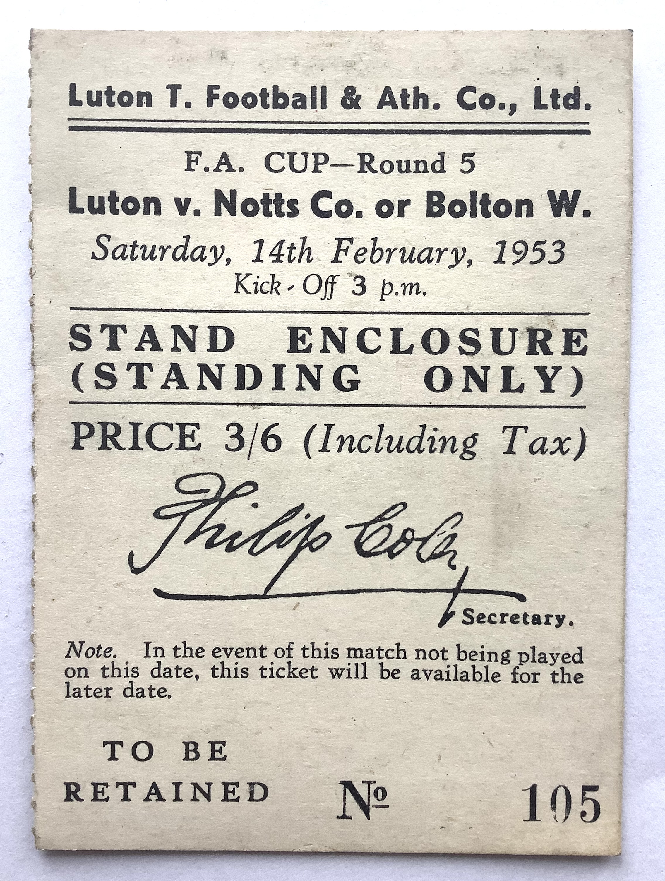 A ticket from Bolton’s run to the famous 1953 Matthews FA Cup Final. Fifth round match played at Luton on 14-02-53. In very good condition.