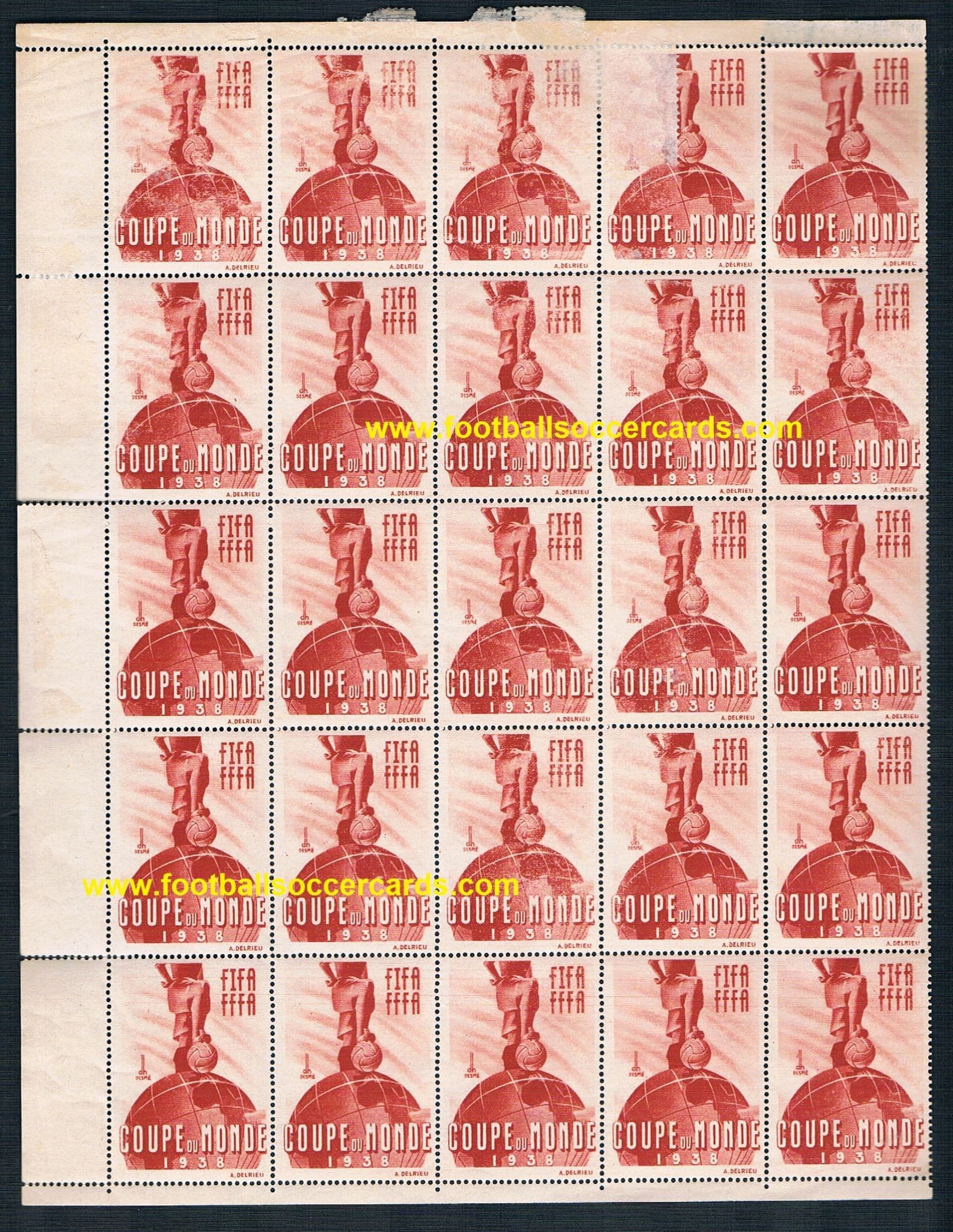Immensely rare! From 1937-1938, from the third World Cup event held in France, this is a WC38 original antiquity a complete sheet of 25 official FIFA - FFFA stamps, private use by officials of FIFA and the Federation of French Football Associations. These were used on envelopes and postcards sent by these football organisations as a way of promoting the event. They may even date as far back as 1936. SOLD AS SEEN, will eb sent folded, as it is now, scanned in its full glory but buyer will see some light faults along the top row. See the pic of the back, also. Original artifacts from the 3rd World Cup in 1938 are ever rarer and always up in price. Only 1. Only 1 seen by this seller. In the collection since 40 years ago. When it's gone, it's gone. SOLD AS SEEN